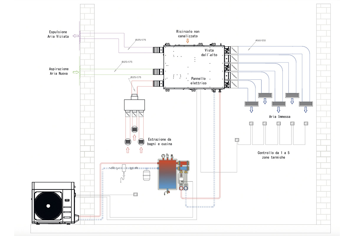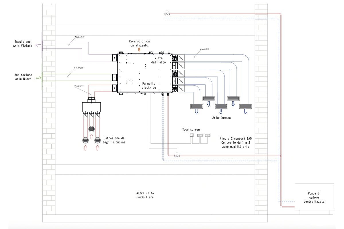 Soluzione ideale per condomìni ed edifici plurifamiliari, consente di integrare climatizzazione e ventilazione meccanica controllata in modo efficiente e centralizzato.